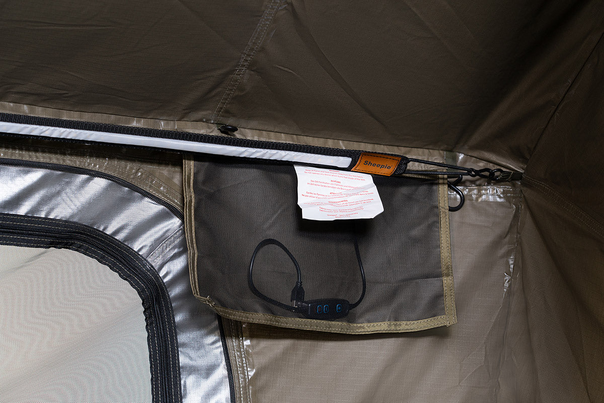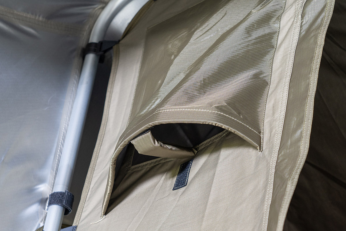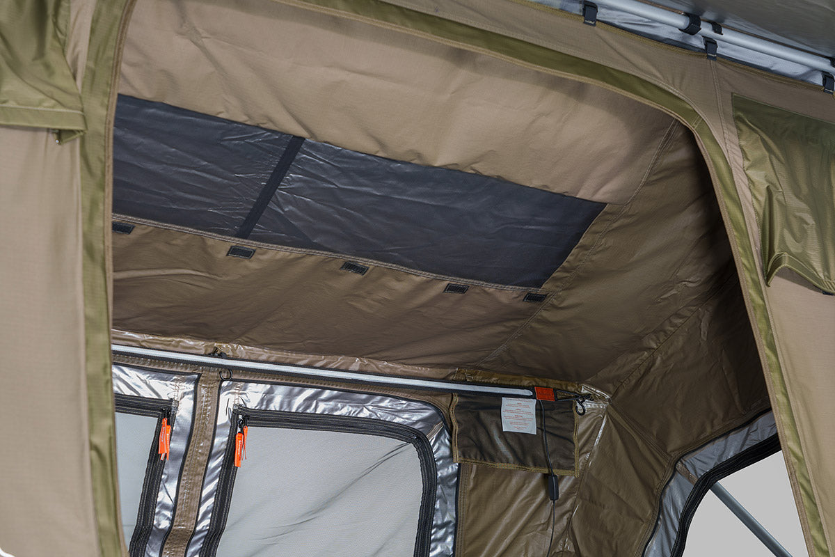 La Jimba Jimba est fournie de série d’un matelas, de sacs à chaussures, de sacs de rangement internes, de moustiquaires, d’une échelle améliorée et d’une bande lumineuse LED intégrée. La housse de la Jimba Jimba a été conçue de manière à ce que des accessoires, tels qu’une couette ou des sacs de couchage, puissent rester à l'intérieur de la tente de toit lorsqu'elle est fermée, libérant ainsi de l'espace de chargement à l'intérieur de votre véhicule.